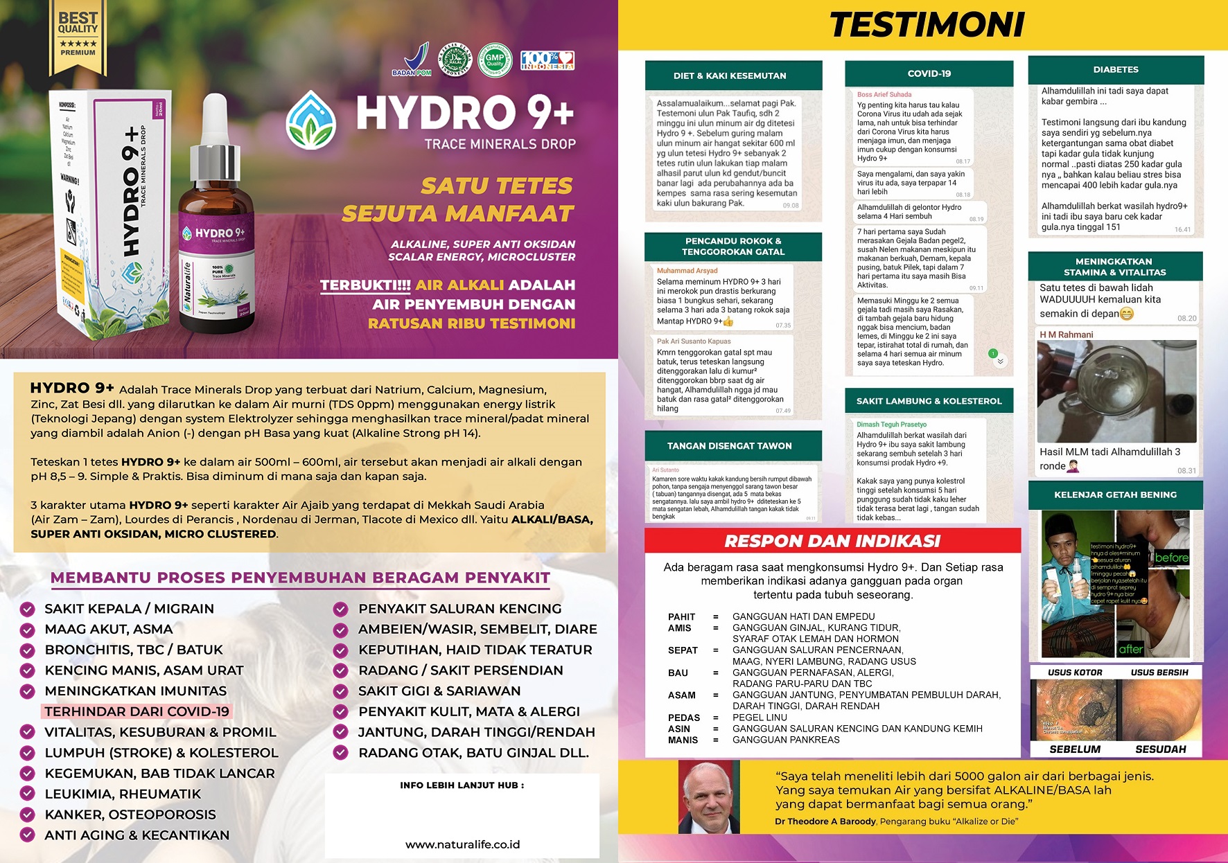 HYDRO9+ bukan obat. HYDRO9+ adalah Biang Alkali yang berbahan dasar alami Mineral ALKALI Grade A (Istimewa), Natrium, Calcium, Magnesium, Zinc, Zat Besi dll.